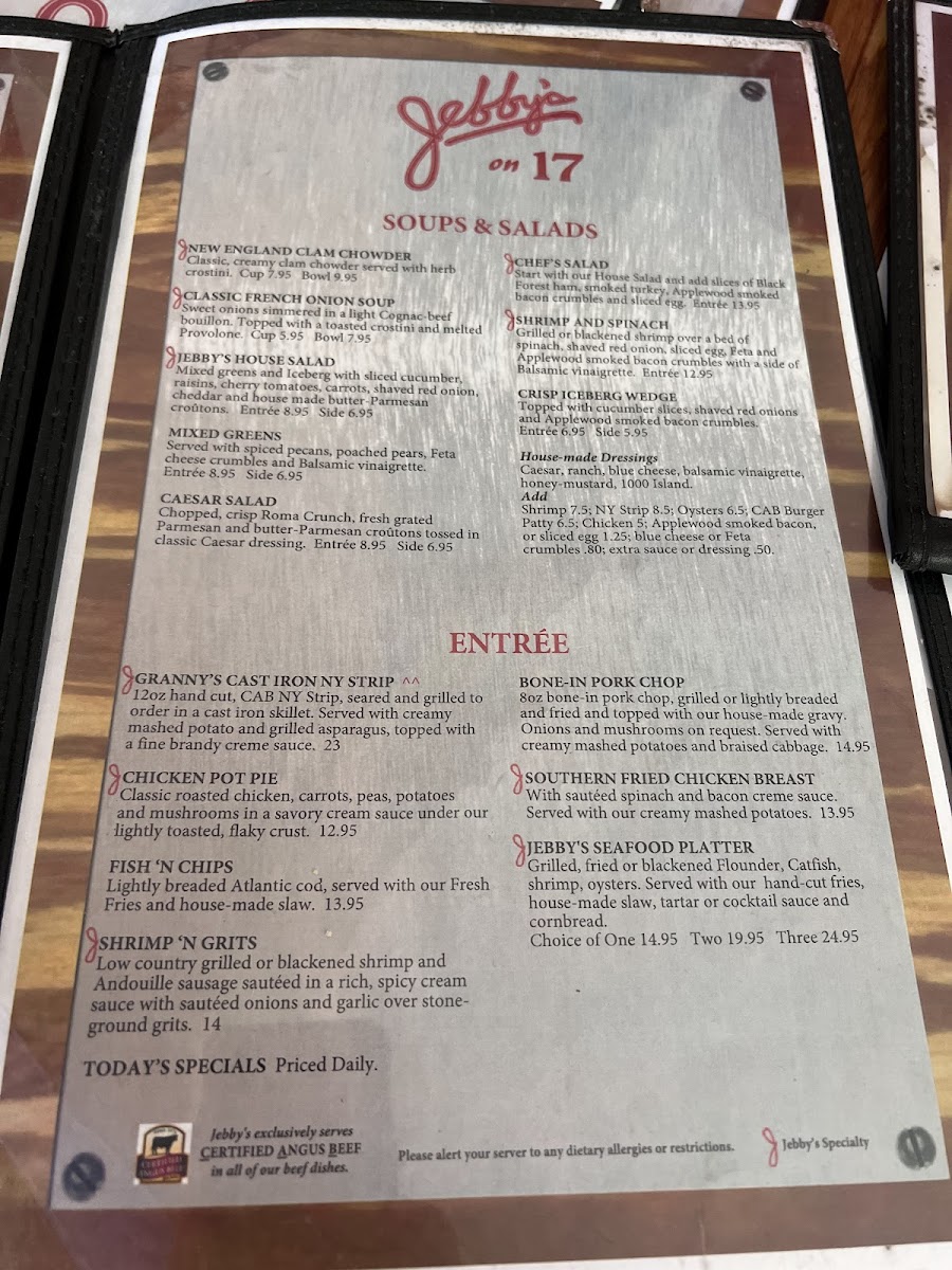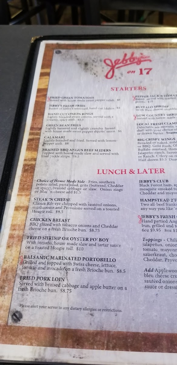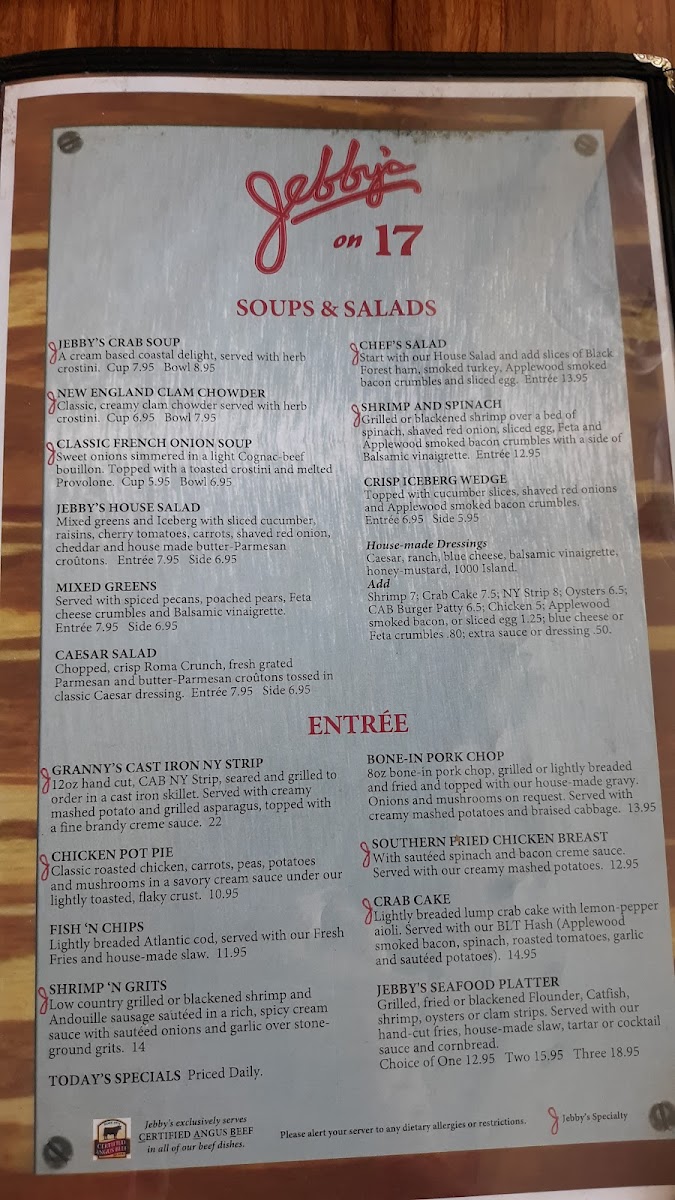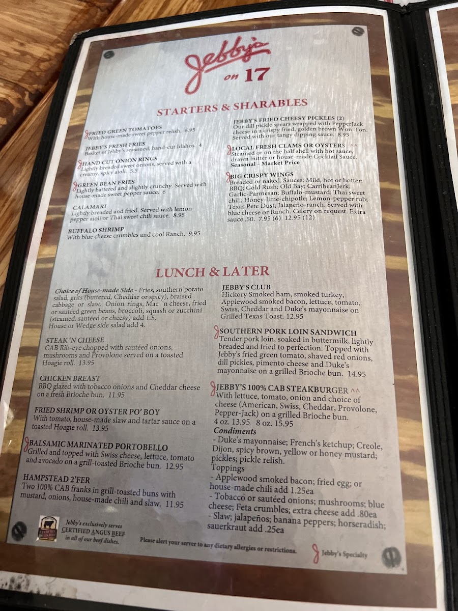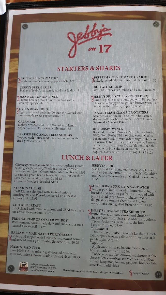 Overall, Jebby’s On 17’s menu delivers a great combination of Southern classics, seafood delights, and comfort food, offering something for everyone. Whether you’re looking for a quick bite or a leisurely meal, you’ll find plenty of options to satisfy your appetite.