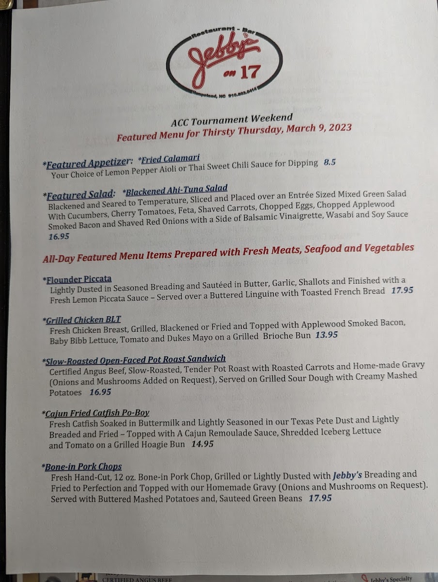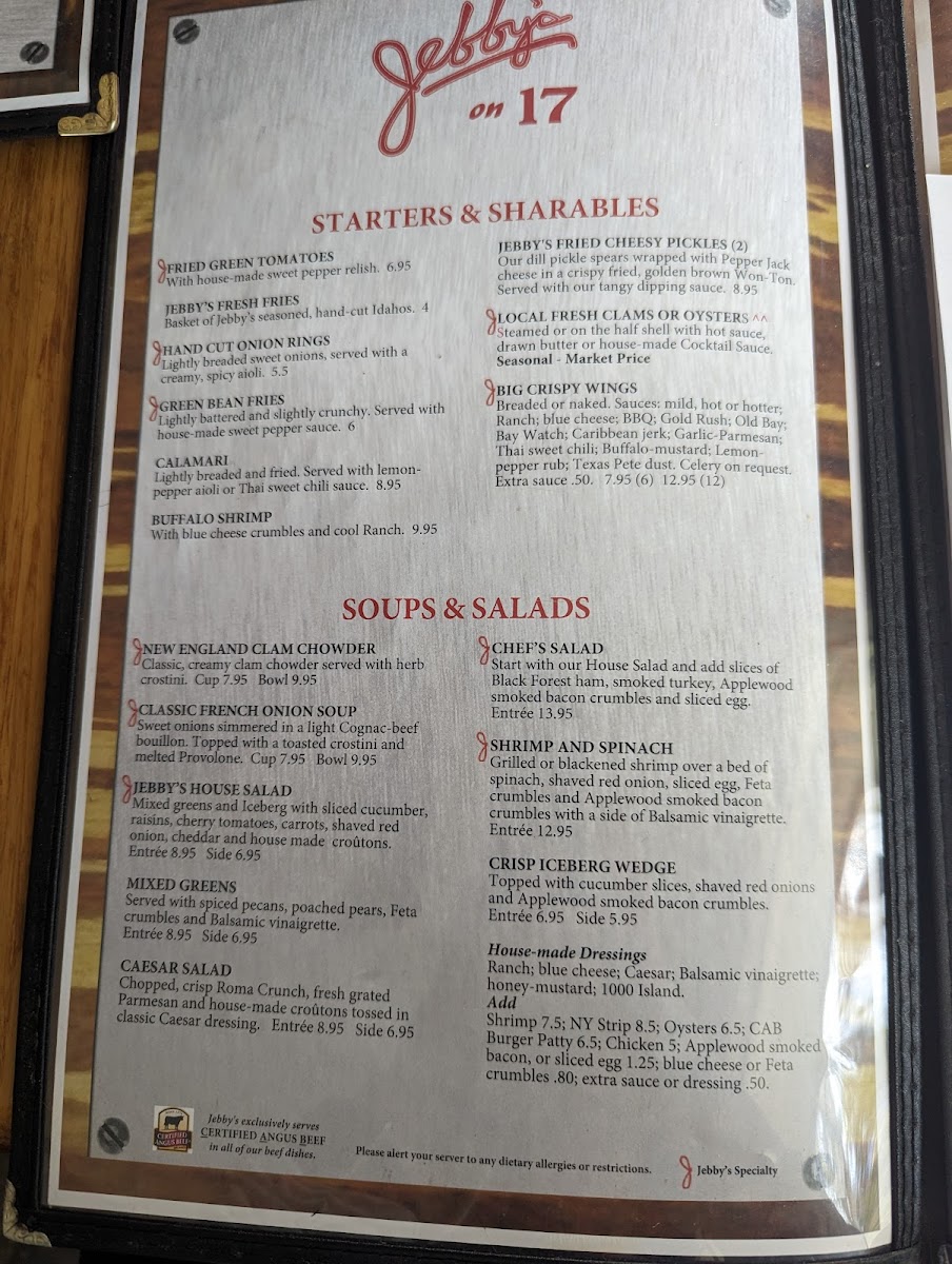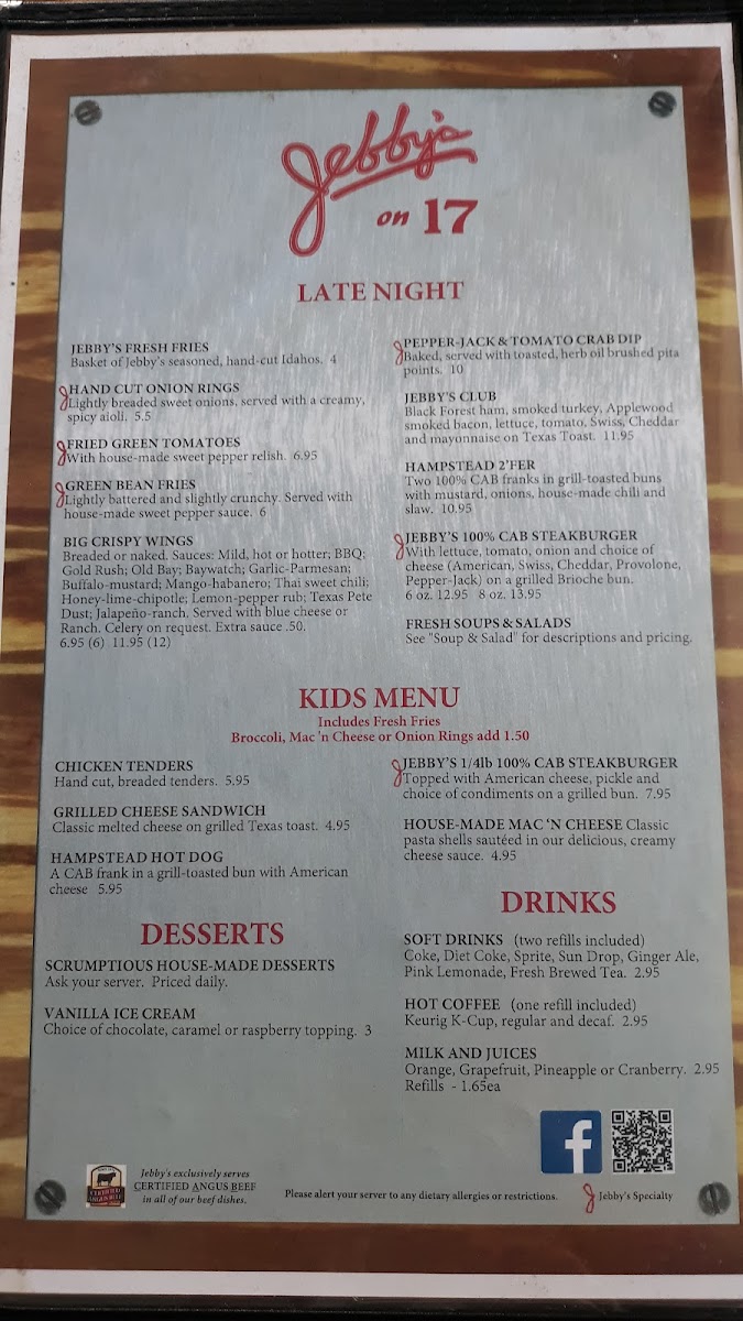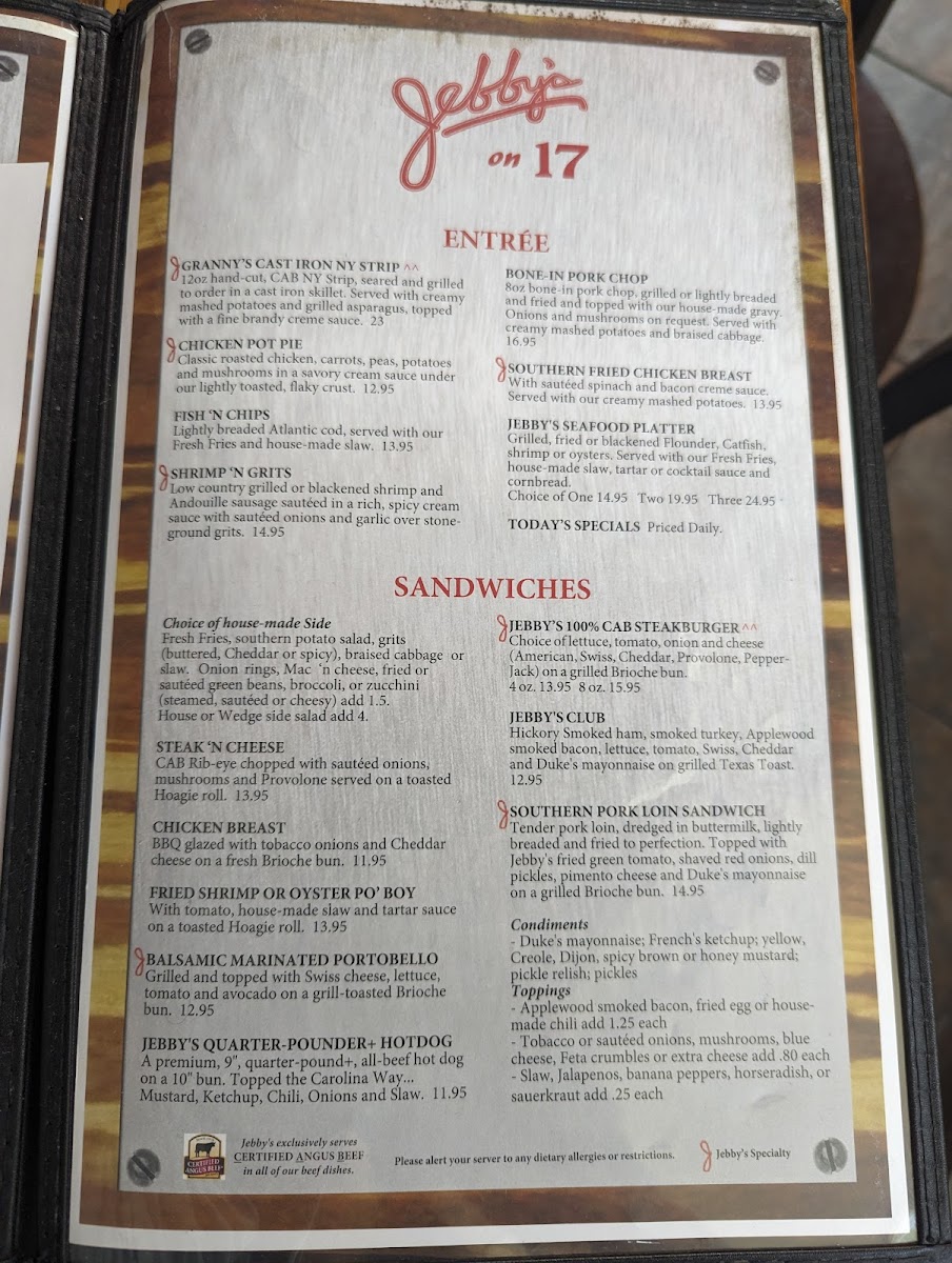 Overall, Jebby’s On 17’s menu delivers a great combination of Southern classics, seafood delights, and comfort food, offering something for everyone. Whether you’re looking for a quick bite or a leisurely meal, you’ll find plenty of options to satisfy your appetite.